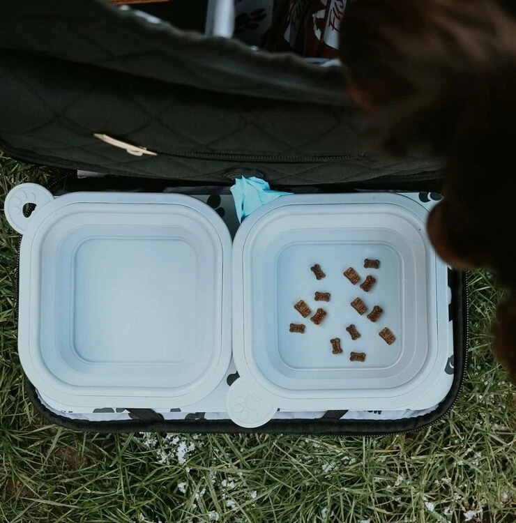 Practical backpack pet travel bag, feeding set included. Built in waste bag dispenser. Meets airline carry on requirements. Placemat & bowls are removeable. Adjustable shoulder straps.
